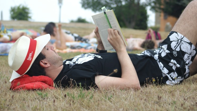 Més fotografies de lectura de les Colònies per saber-ho tot de l’asma! Avui és el torn del Mateu que, tranquil·lament jagut a l’herba, llegeix Cuentos completos de Philip K. Dick.
