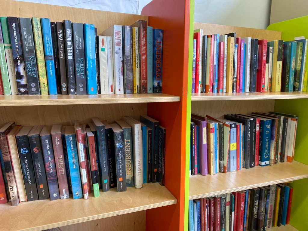 Diversitat de gèneres, de formats, d’autors… Un ampli ventall de llibres col·locats en uns carros mòbils súper xulos que es mouen per les aules quan és hora de Bufet.