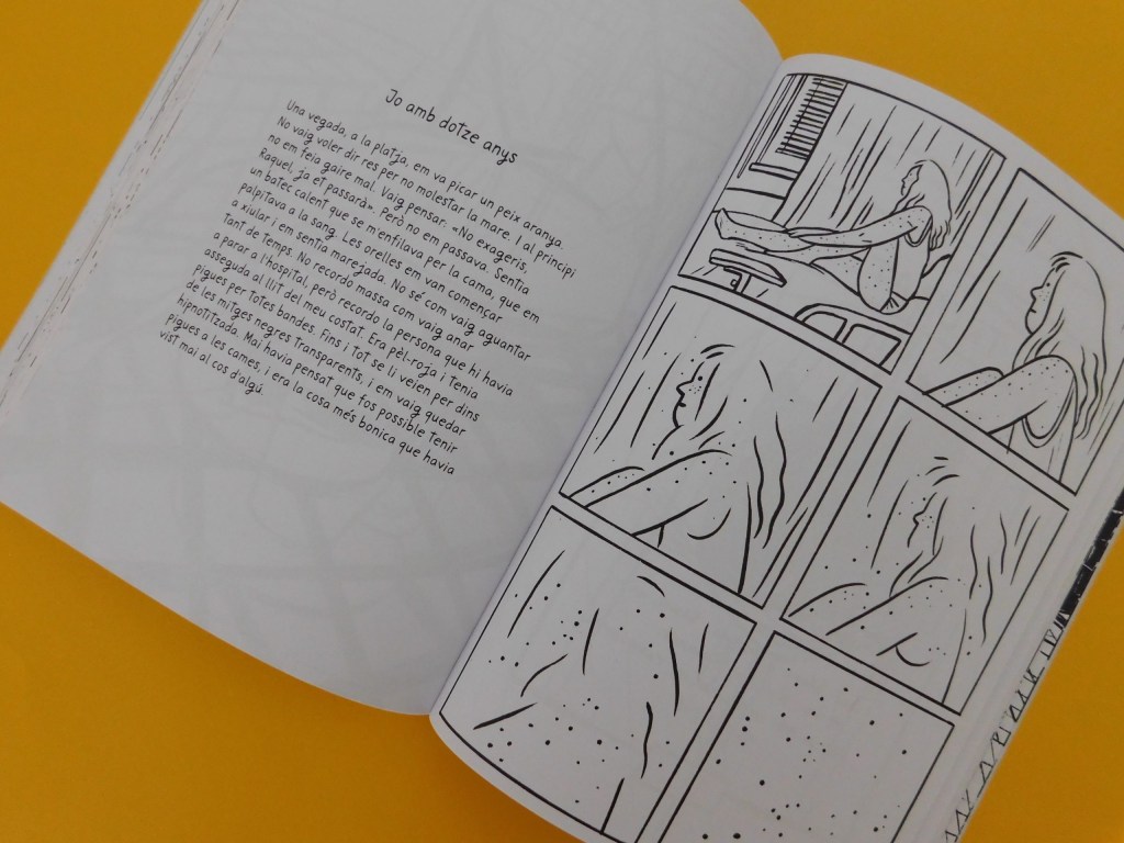 I què dir del format? Quina meravella! Només d’agafar-lo ja es veu que està cuidat fins al més mínim detall: el tacte de la coberta, les cantonades arrodonides… Les il·lustracions juguen amb el blanc i el negre i va combinant vinyetes amb il·lustracions de pàgina sencera o dobles pàgines. Pel que fa al format, m’ha agradat molt la combinació de la novel·la gràfica convencional amb pàgines senceres de text, trobo que enriqueix el gènere i fa que la lectura sigui singular.