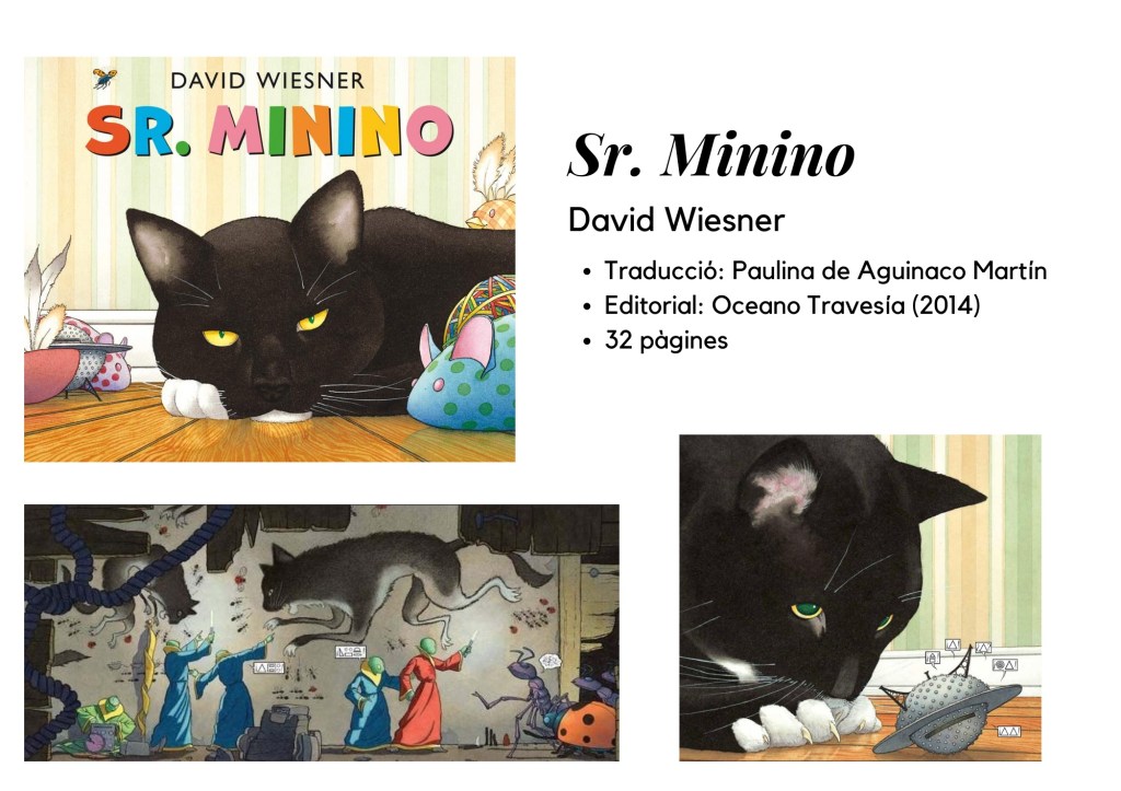 Quan vaig veure que a la llista d’àlbums per fer la tria del nostre #top10 a l’assignatura “Llibres infantils i juvenils” del màster hi havia un Wiesner, no ho vaig dubtar perquè és un autor que em fascina i Sr.Minino és un àlbum que no coneixia i tenia pendent. Els que conec més són Flotante i Els tres porquets perquè els treballo a Secundària, i Martes m’agrada especialment. Ara, havent llegit Sr.Minino (no prou vegades encara, crec que em falten algunes lectures més per seguir descobrint detalls), no dubto a posar-lo al Top10.